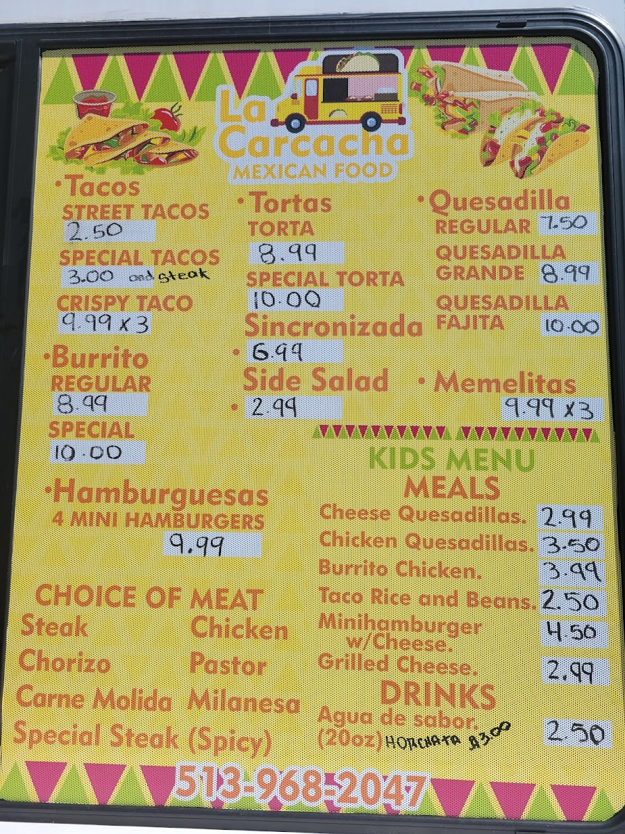From a reviewer’s perspective, La Carcacha Food Truck at 550 Oxford State Rd offers a vibrant menu that balances classic Mexican flavors with playful comfort food. The Crispy Tacos Order Of 3 are a standout, paired perfectly with a Side Salsa Verde and Cheese And Chips, making for a satisfying and shareable starter. For a heartier bite, the 4 Mini Hamburguesas accompanied by a Side Rice showcase the truck’s ability to blend traditional and modern favorites. Drinks like Mexican Coke, Horchata, and Jarritos provide authentic refreshment that complements the savory offerings. Families will appreciate the thoughtfully curated kids’ options, including the Kid Chicken Quesadilla, 2 Mini Hamburgers, Kid Cheese Quesadilla, and Kid Burrito, each paired with staples like Taco Rice And Beans, ensuring younger diners are well catered for. Overall, the menu at La Carcacha Food Truck is approachable, flavorful, and reasonably priced, appealing to both adults and children while offering a taste of Mexican-inspired street food in a casual, friendly setting.